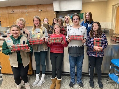 10/25/2023 - Cadette, Senior and Ambassador Girl Scouts helped wrap Silent Auction boxes for our Fall Bazaar at St Paul Lutheran Church. Thanks to Andrea Dutcher who led the project