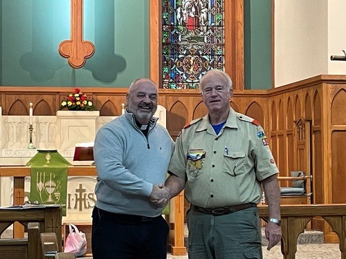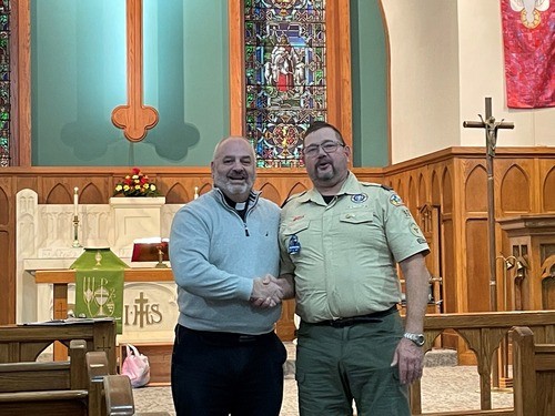 11/11/2023 – Two Servant Leaders of the month for November. Thanks to Chris Harsch for his efforts within the church as our Boy Scout Master. He received a coin to celebrate this special moment.