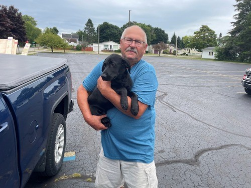 8-16-2024 - Dennis stopped by with his new best friend "Max." Max is a purebred Black lab, and he is all puppy. I blessed Max and I celebrate the love, energy and joy he has to share with the Dziesinski family.